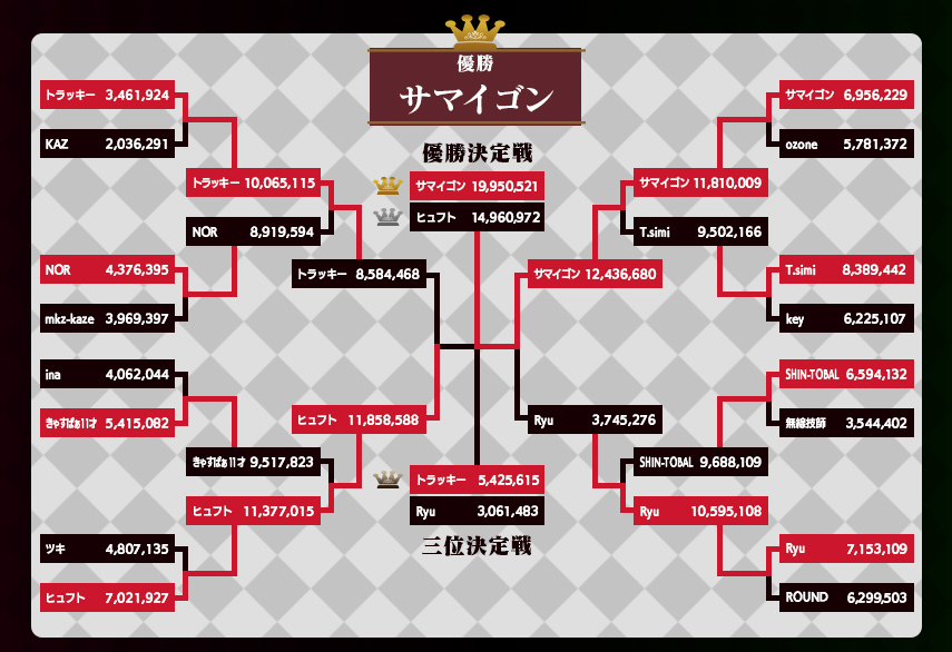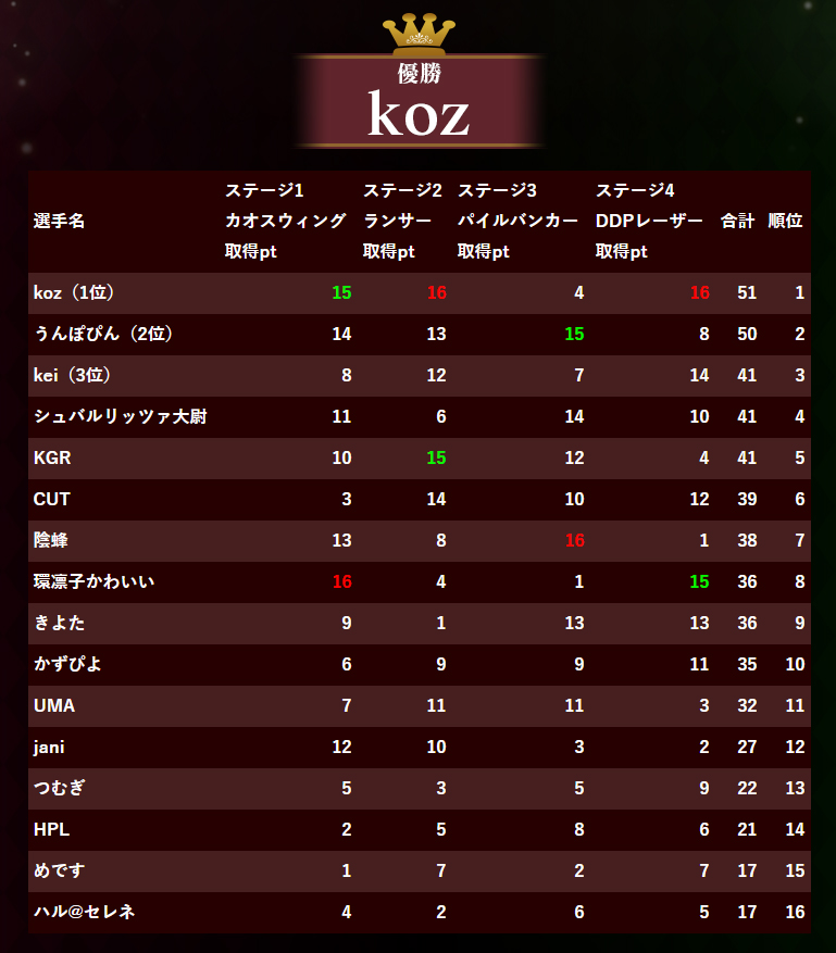 koz「今回のルールで言えば、僕が出た激難カテゴリーはポイント制ってのが本当に面白い要素でしたね。僕自身、2回戦まで首位、でも3回戦のパイルバンカーで下から4番目の成績。そこからDDPで稼ぎきれたので優勝できましたけど、皆さんのポイント表みてると、すごく面白いですね。」