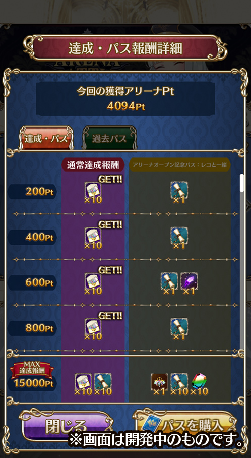 ※ランキング期間中にアリーナパスを購入した場合、その時点までに獲得したアリーナポイントの数に応じた報酬を獲得することができます。