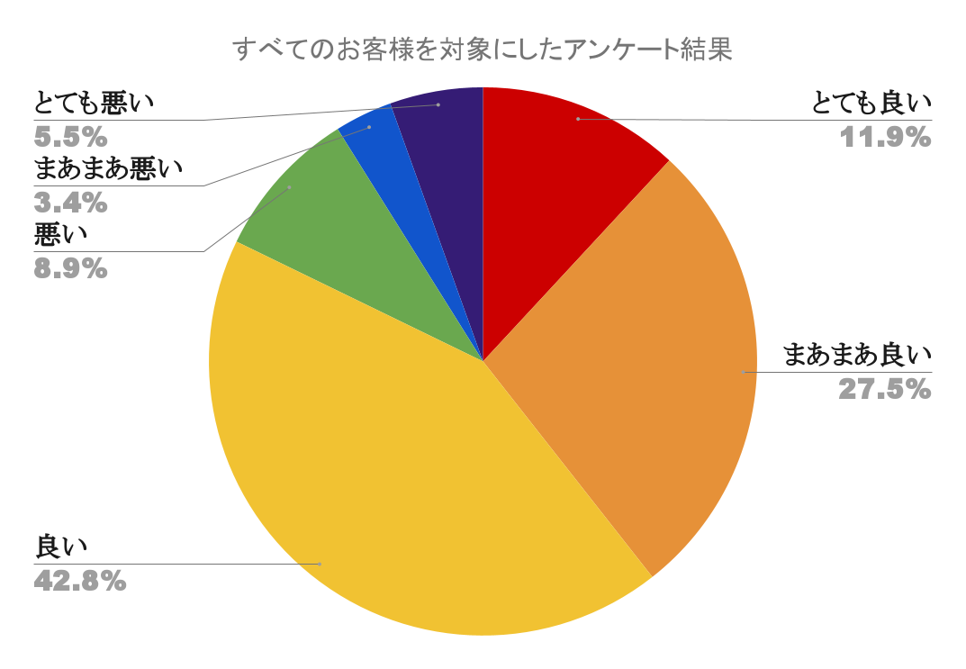 全てのお客様を対象に抽出したアンケート結果では「悪い」「まあまあ悪い」「とても悪い」が合計約18%となります。