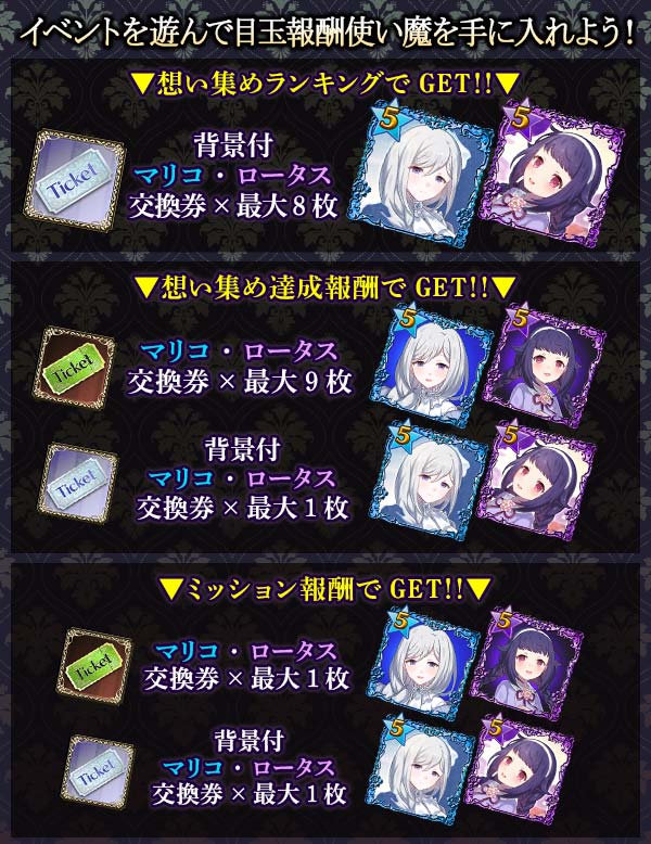 normalのスコアS評価報酬で「超乙女ガチャチケット」や、関連するイベントミッションで称号や「マリコ・ロータス交換券」「背景付マリコ・ロータス交換券」などがもらえる!