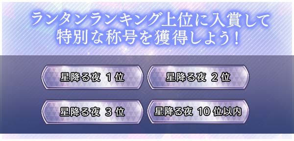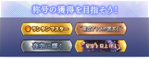 称号 獲得条件 エウリカ推し ミッション達成 ランタンマスター ランタン獲得3,000個達成 星空ドレスの彼女と ミッション達成 LOVE魅せ★マスター ミッション達成 夜空に輝く 星空LOVE★魅せスコアタ2000位以内 星空を見上げる ランタンランキング1000位以内