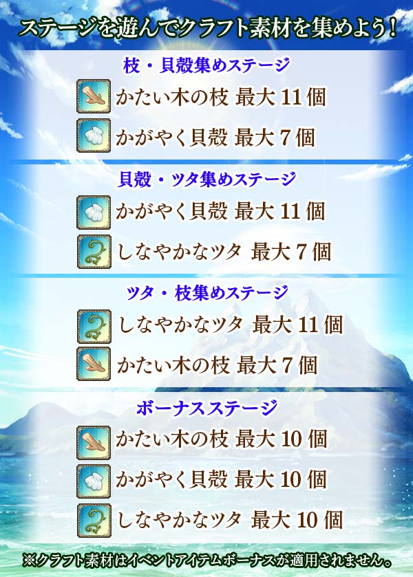 | 各乙女:枝・貝殻集め 各乙女:貝殻・ツタ集め 各乙女:ツタ・枝集め |