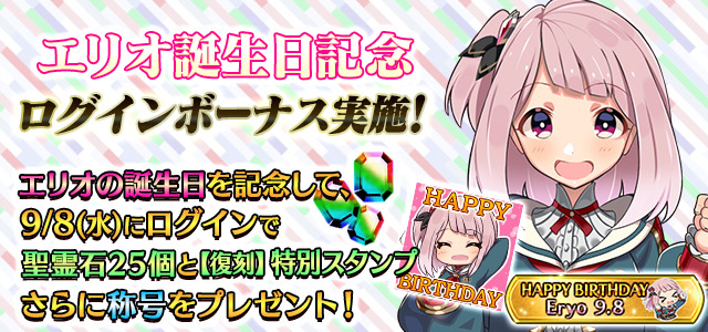エリオの誕生日を記念して、誕生日当日にログインすると「聖霊石:25個」と、掲示板で使用できる【復刻】特別スタンプや、称号をプレゼント!!