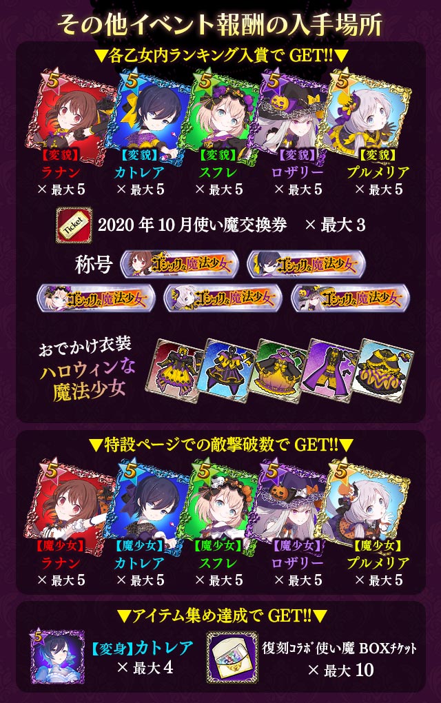 | 151~300位 | おでかけ衣装:【変貌】シリーズの各5乙女の衣装×1 2020年10月使い魔交換券×2 |