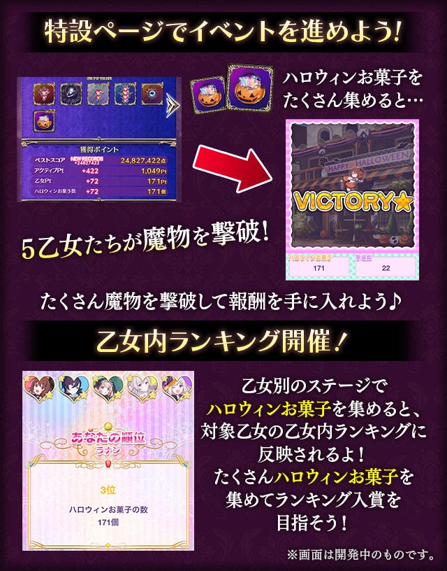 特設ページにて獲得可能な【変貌】シリーズの5乙女おでかけ衣装「ハロウィンな魔法少女」の獲得方法が、特設ページでは『300位以内入賞で獲得可能』、ステージ選択画面での目玉報酬では『500位以内入賞で獲得可能』と情報に差異がある不具合を確認しました。