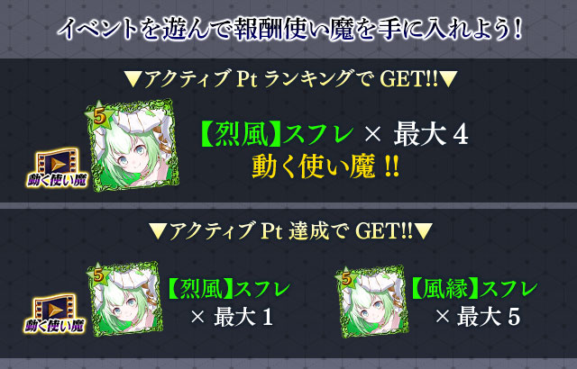イベントステージを遊んだり大ボスを討伐したりすることで、豪華報酬がもらうことができるアクティブPtが溜まっていきます。