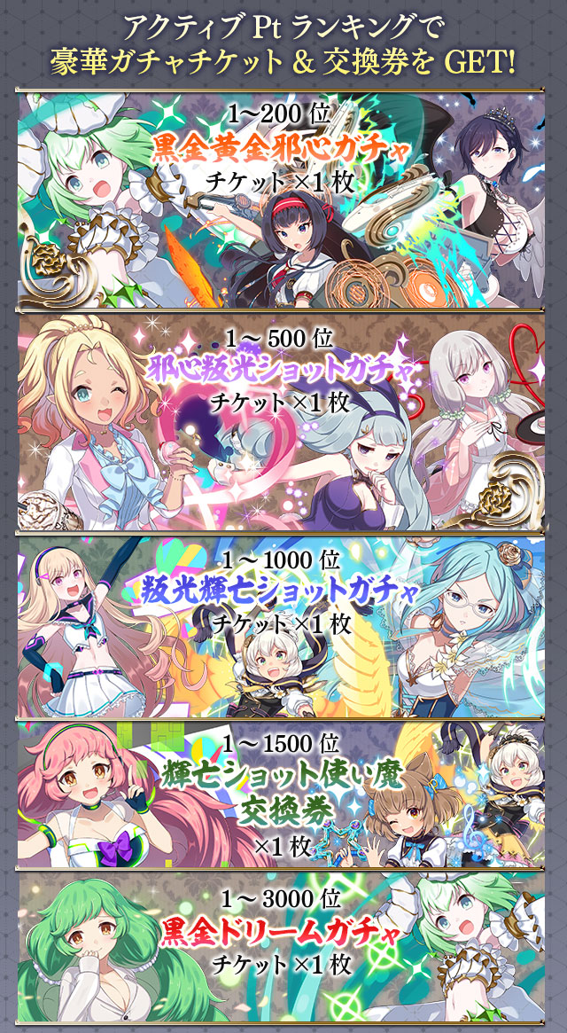 - アクティブPt達成報酬はホーム画面[イベント]ボタン上のランキングボタン>[各種ランキング]内の[報酬を見る]や[ポイント達成報酬を見る]より確認できます。