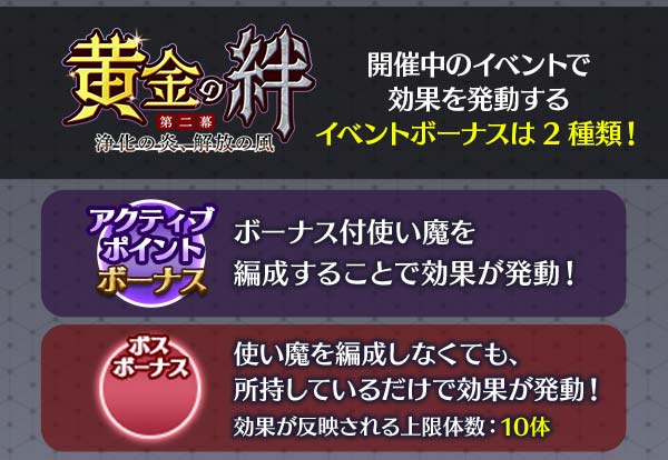 - ボーナス効果が有効なクエストでは、出撃前の使い魔編成確認時にボーナス付使い魔にボーナスアイコンが表示されます。