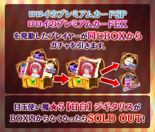 - 【BOX内すべての中身が0】もしくは【BOX内の目玉使い魔の残数が0】になった場合、「SOLD OUT」となり、本シェアBOXガチャを引くことができなくなります。