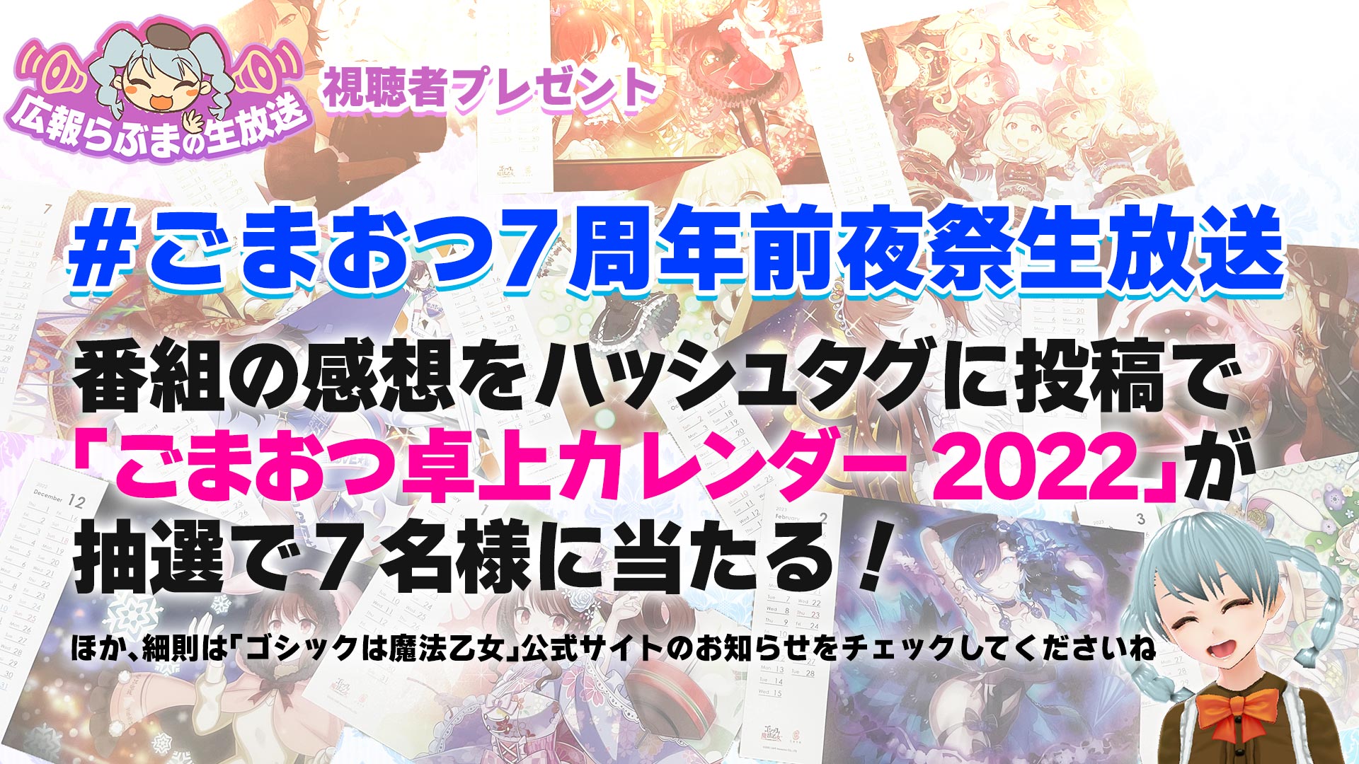 『ごまおつ』公式Twitter(@mahouotome_info)をフォロー&対象ハッシュタグ「#ごまおつ7周年前夜祭生放送」を入れた生放送番組を視聴した感想を投稿すると、抽選で7名様に「ごまおつ卓上カレンダー2022」が当たる!