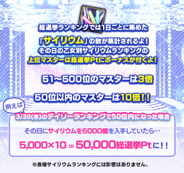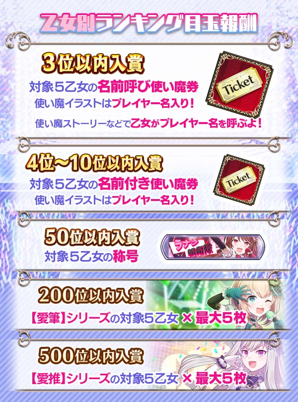 - 複数の乙女内ランキングに入賞し、片方の敬称が指定されていた場合、指定のなかった乙女はデフォルトの敬称を適用いたします。