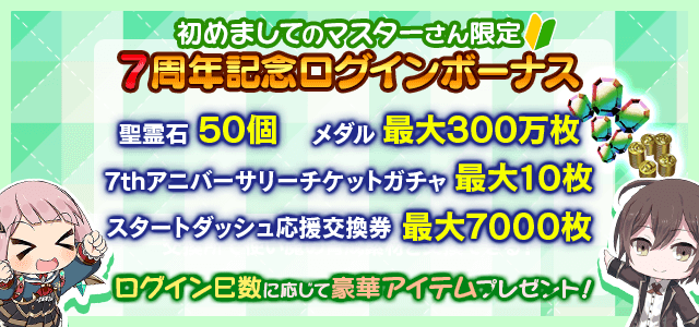 | 通算1日 | 聖霊石×50 7thアニバーサリーガチャチケット×1 スタートダッシュ応援交換券×700 メダル×300000 |