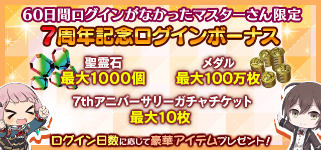 | 2日目 | 聖霊石×100 7thアニバーサリーガチャチケット×1 メダル×100,000 |