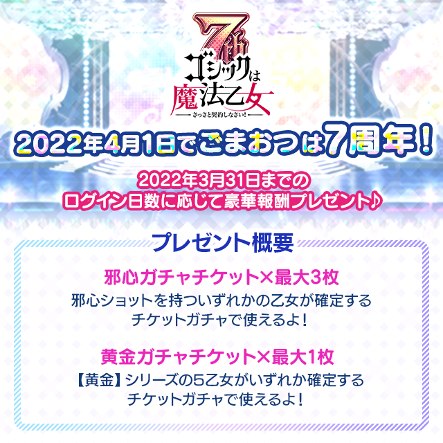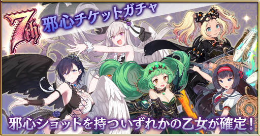 「邪心ガチャチケット」「黄金ガチャチケット」は4/1(金)0:00~4/27(水)メンテナンスまでの期間中の初回ログイン時、プレゼントを経由せず直接配布いたします。