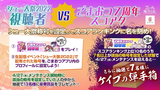 生配信イベント「シュー大祭2022」ケイブ放送枠で配布された称号をごまおつアプリ内のプロフィールに設定して、「7周年スコアタ前半戦」「7周年スコアタ後半戦」に挑戦しよう!