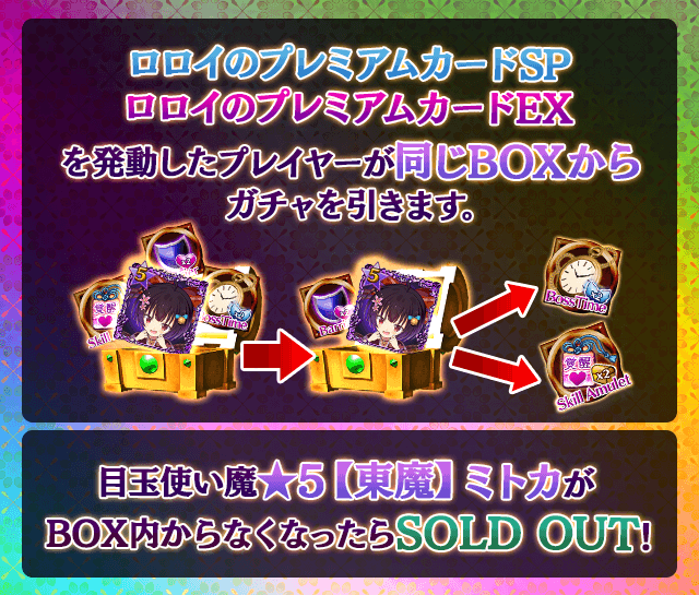 - 【BOX内すべての中身が0】もしくは【BOX内の目玉使い魔の残数が0】になった場合、「SOLD OUT」となり、本シェアBOXガチャを引くことができなくなります。