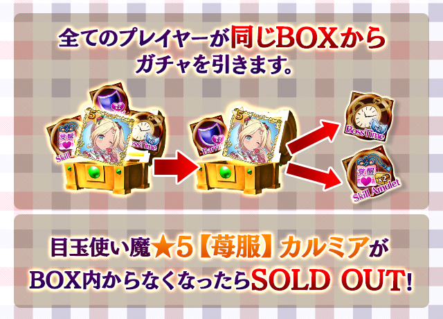 - 【BOX内すべての中身が0】もしくは【BOX内の目玉使い魔の残数が0】になった場合、「SOLD OUT」となり、本シェアBOXガチャを引くことができなくなります。
