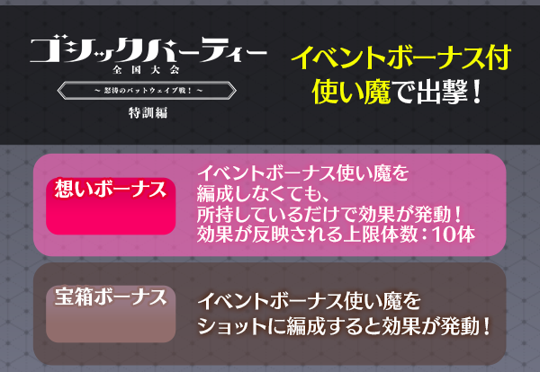 - 【ゴシックパーティー全国大会 第三章 怒涛のバットウェイブ戦!~本戦編~】の詳細は、5/23(月)メンテナンス後に公開予定のお知らせをご確認ください。