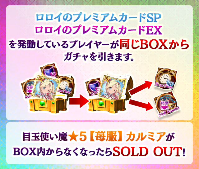- 【BOX内すべての中身が0】もしくは【BOX内の目玉使い魔の残数が0】になった場合、「SOLD OUT」となり、本シェアBOXガチャを引くことができなくなります。