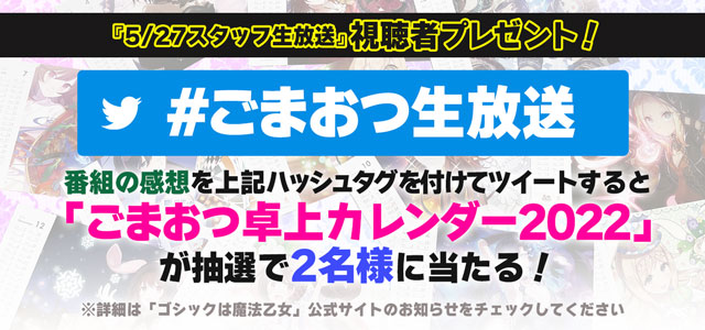 ケイブ公式YouTube「CAVE Official」にて5/27(金)に放送の「【スタッフ生放送】新ショット紹介&ごまおつ今後のアップデート情報」を視聴し、Twitterで『ゴシックは魔法乙女』公式アカウント(@mahouotome_info)をフォロー&Twitterで「#ごまおつ生放送」を入れた感想を投稿すると、抽選で2名様に「ごまおつ卓上カレンダー2022」が当たる!