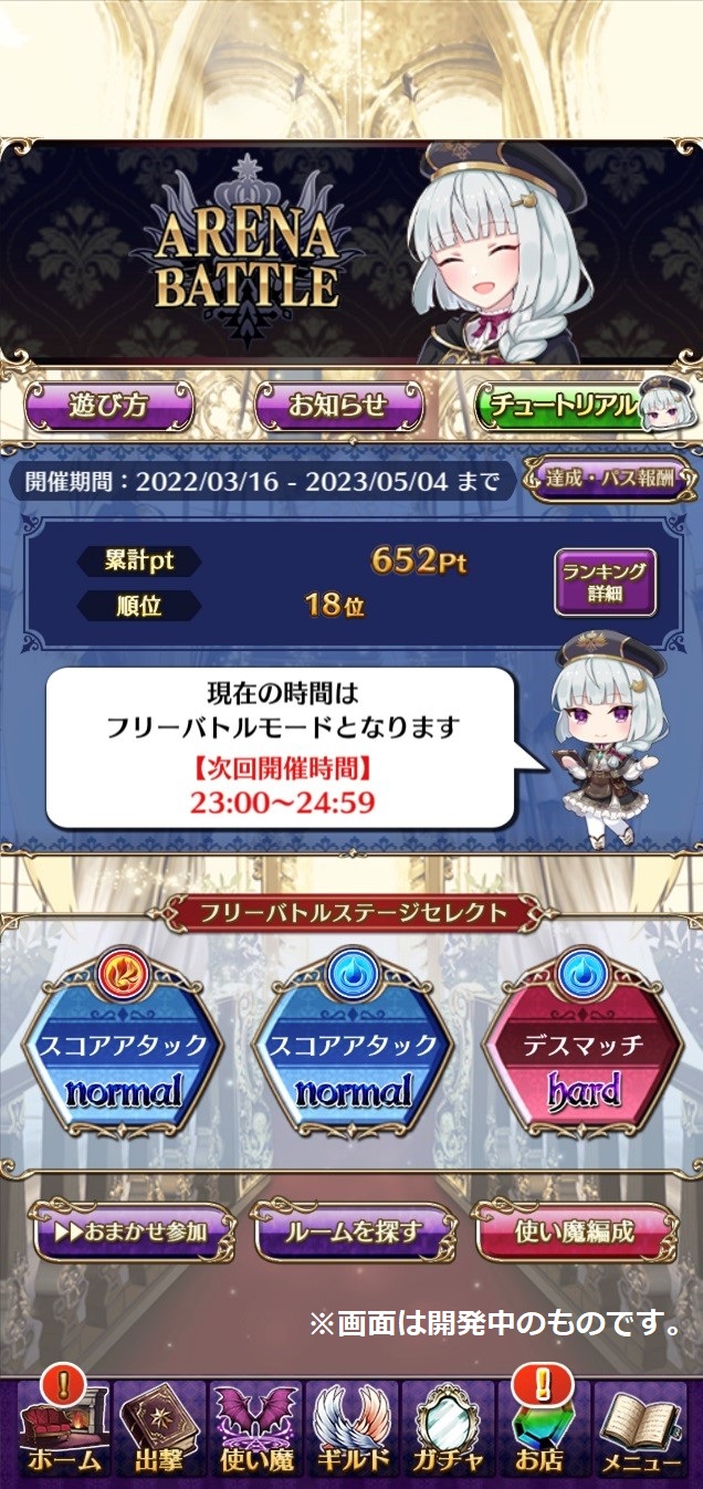 アリーナのランキングバトルを開催していない時間に、いつでもプレイヤー自身でルームを作成し対戦することができるフリーバトル機能を追加いたしました。