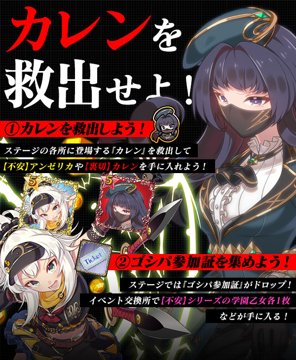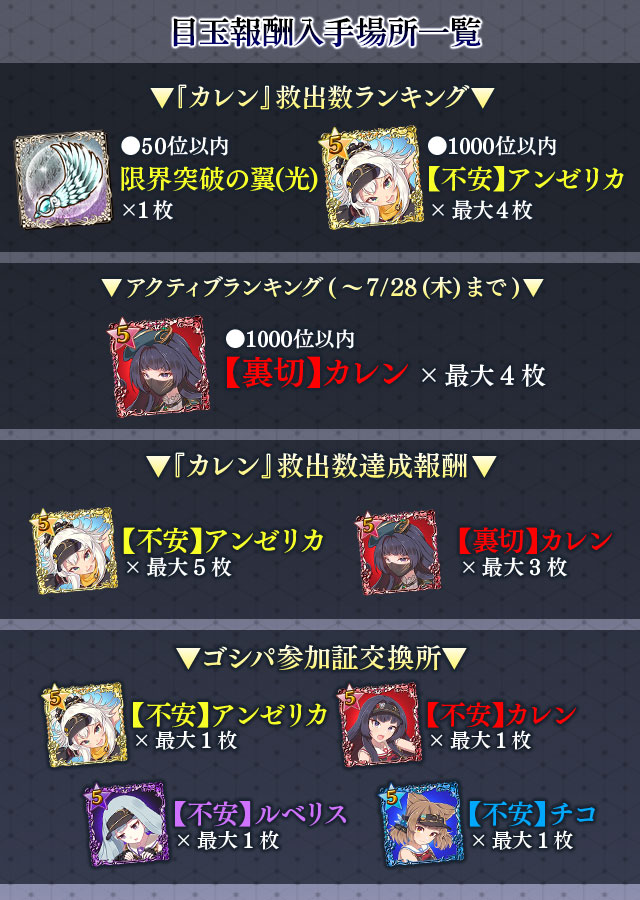 | 終了日時 | 2022/7/21(木) 23:59 | 解放条件 | 「カレン」を100救出 |