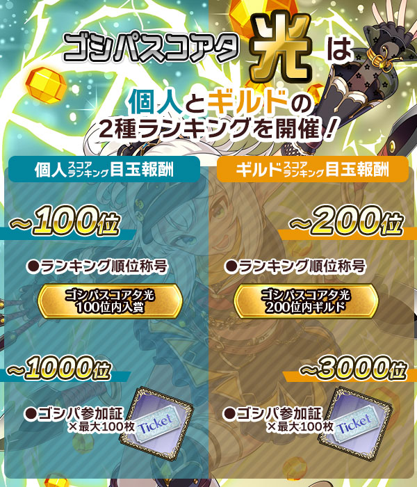 - 対象スコアタに参加済みでギルドに加入した場合、その時点のハイスコアでは登録されず、加入後に獲得したハイスコアで登録されます。