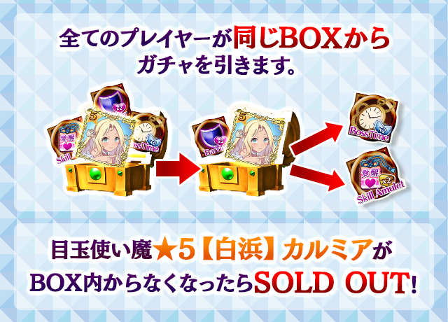 - 【BOX内すべての中身が0】もしくは【BOX内の目玉使い魔の残数が0】になった場合、「SOLD OUT」となり、本シェアBOXガチャを引くことができなくなります。
