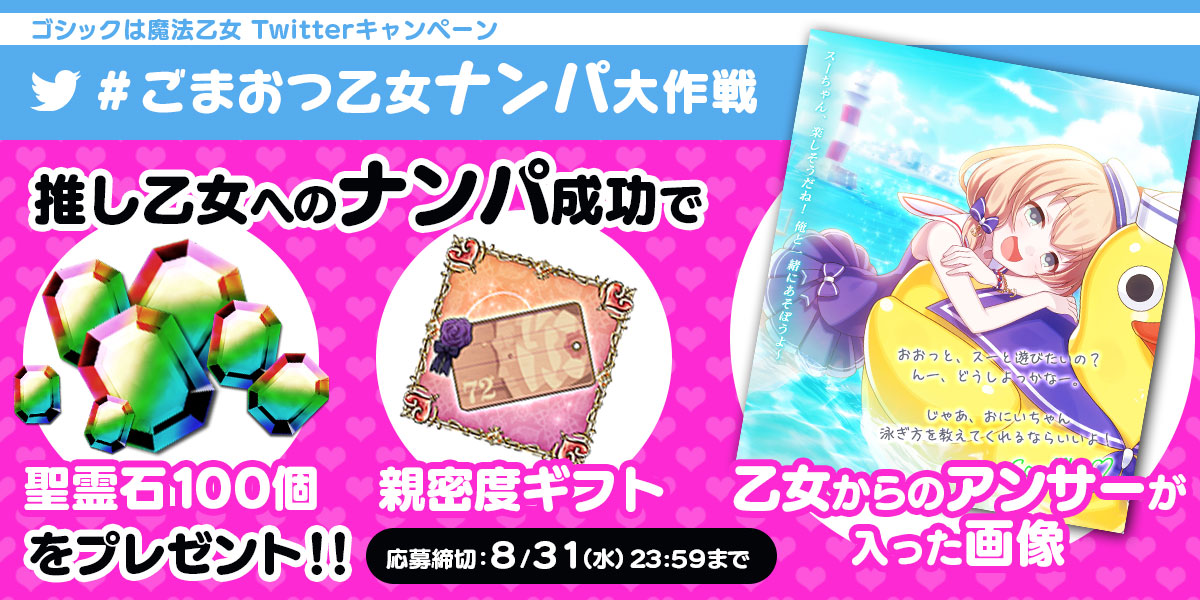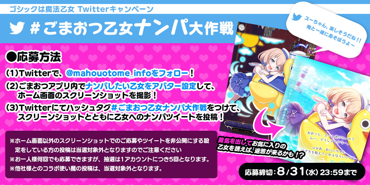 ごまおつ公式Twitter(@mahouotome_info)をフォローして、ホーム画面の乙女のスクリーンショットと一緒に#ごまおつ乙女ナンパ大作戦をつけてナンパツイートをしよう!