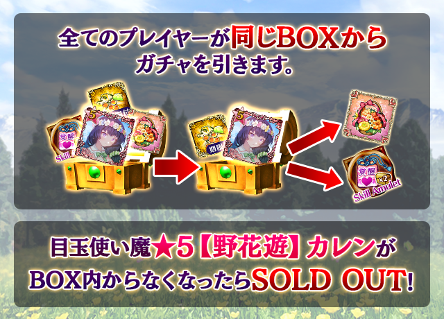 - 【BOX内すべての中身が0】もしくは【BOX内の目玉使い魔の残数が0】になった場合、「SOLD OUT」となり、本シェアBOXガチャを引くことができなくなります。