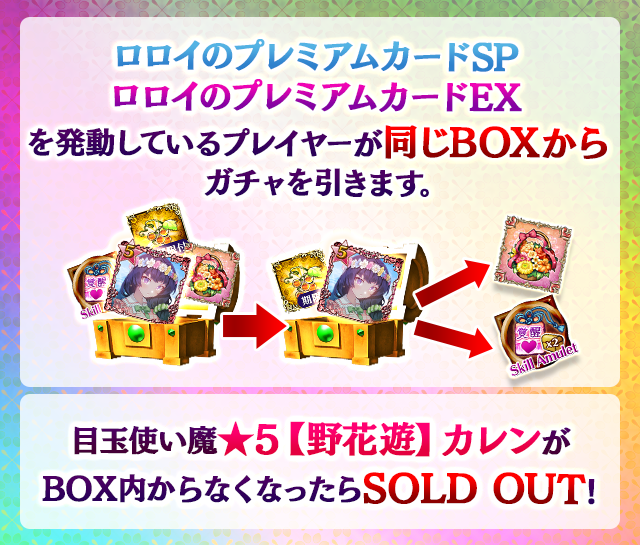 - 【BOX内すべての中身が0】もしくは【BOX内の目玉使い魔の残数が0】になった場合、「SOLD OUT」となり、本シェアBOXガチャを引くことができなくなります。