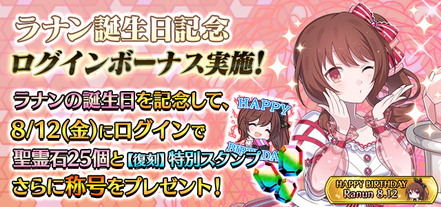 ラナンの誕生日を記念して、誕生日当日にログインすると「聖霊石:25個」と、掲示板で使用できる【復刻】特別スタンプや、称号をプレゼント!!
