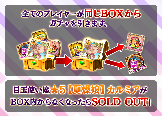 - 【BOX内すべての中身が0】もしくは【BOX内の目玉使い魔の残数が0】になった場合、「SOLD OUT」となり、本シェアBOXガチャを引くことができなくなります。