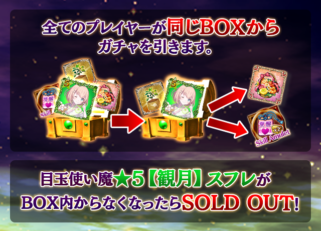 - 【BOX内すべての中身が0】もしくは【BOX内の目玉使い魔の残数が0】になった場合、「SOLD OUT」となり、本シェアBOXガチャを引くことができなくなります。