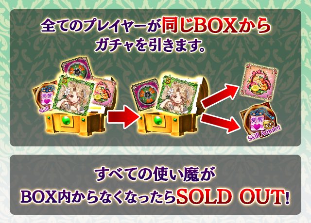 - 【BOX内すべての中身が0】もしくは【BOX内の目玉使い魔の残数が0】になった場合、「SOLD OUT」となり、本シェアBOXガチャを引くことができなくなります。