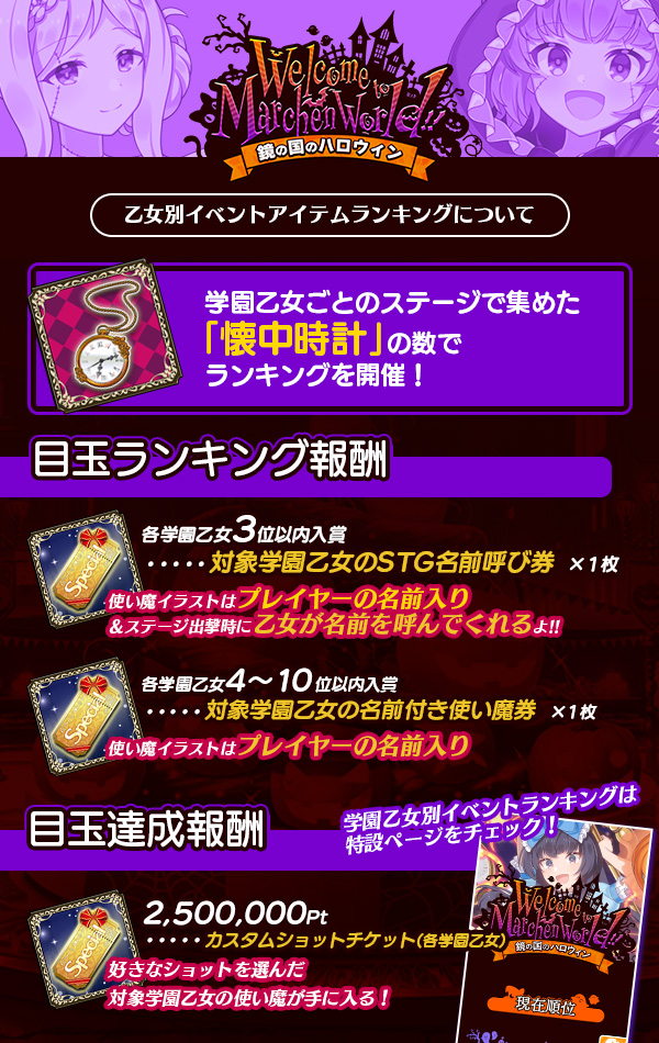 ハロウィンイベント【Welcome to Marchen World!! 鏡の国のハロウィン】の学園乙女Ptを2,500,000Ptを集め達成報酬でカスタムショットチケットを獲得したお客様は、アプリ内の本お知らせ内、もしくはアプリ内のお知らせ一覧の上部にある入力フォームよりご連絡ください。
