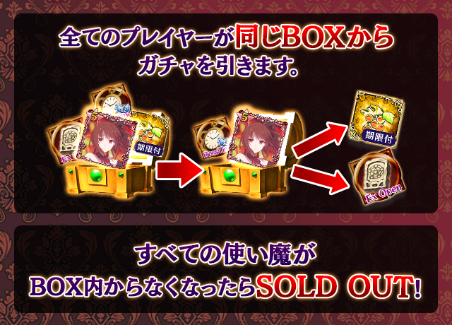 - 【BOX内すべての中身が0】もしくは【BOX内の目玉使い魔の残数が0】になった場合、「SOLD OUT」となり、本シェアBOXガチャを引くことができなくなります。