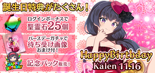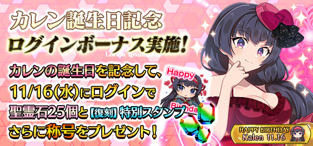 カレンの誕生日を記念して、誕生日当日にログインすると「聖霊石:25個」と、掲示板で使用できる【復刻】特別スタンプや、称号をプレゼント!!