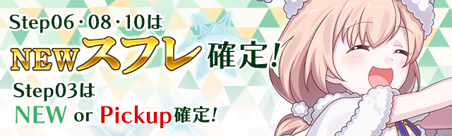 - ステップアップガチャは、Step数によってガチャの提供内容が変化します。 Step数の上昇により必ずしも提供内容がより良い内容に変化することを保証するわけではありません。