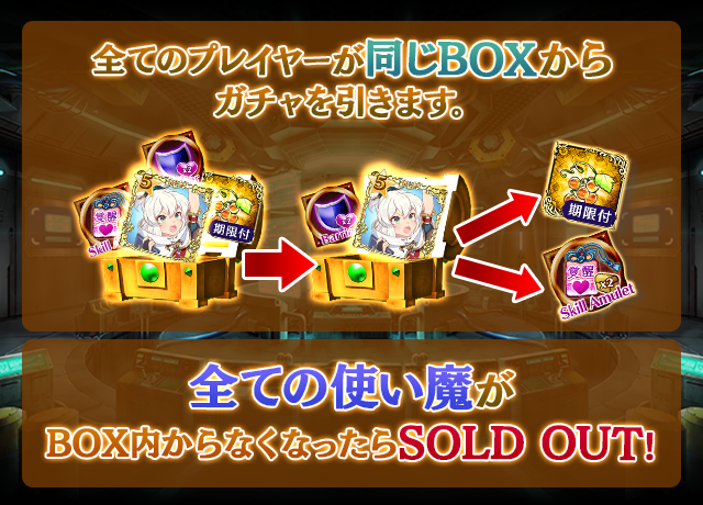 - 【BOX内すべての中身が0】もしくは【BOX内の目玉使い魔の残数が0】になった場合、「SOLD OUT」となり、本シェアBOXガチャを引くことができなくなります。
