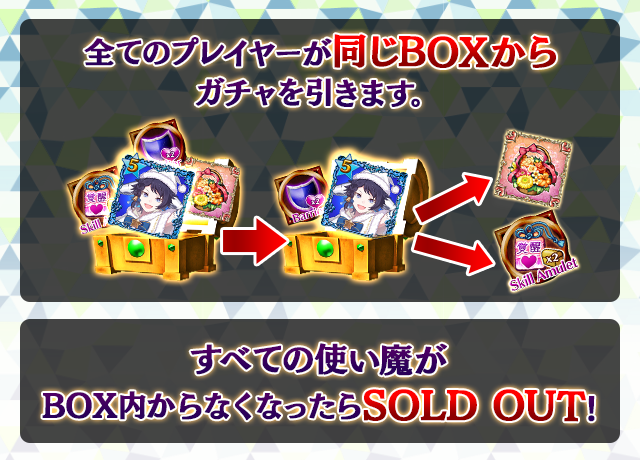 - 【BOX内すべての中身が0】もしくは【BOX内の目玉使い魔の残数が0】になった場合、「SOLD OUT」となり、本シェアBOXガチャを引くことができなくなります。