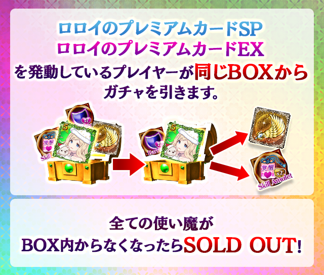 - 【BOX内すべての中身が0】もしくは【BOX内の目玉使い魔の残数が0】になった場合、「SOLD OUT」となり、本シェアBOXガチャを引くことができなくなります。