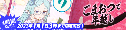 ☆ごまおつで年越しステージ解放☆ 4時間限定解放!! ステージクリアで特別称号GET♫ イベントクエスト解放期間 ごまおつで年越し 開始日時 2022/12/31(土) 23:00 終了日時 2023/1/1(日) 03:00 有利属性 水