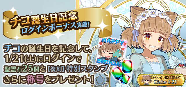 チコの誕生日を記念して、誕生日当日にログインすると「聖霊石:25個」と、掲示板で使用できる【復刻】特別スタンプや、称号をプレゼント!!