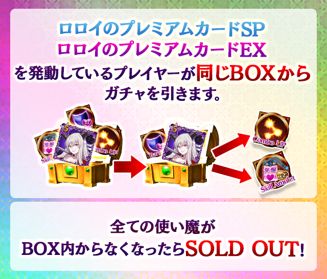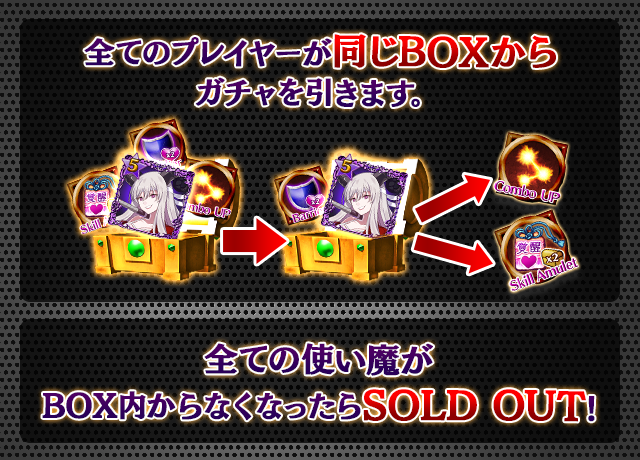 - 【BOX内すべての中身が0】もしくは【BOX内の目玉使い魔の残数が0】になった場合、「SOLD OUT」となり、本シェアBOXガチャを引くことができなくなります。