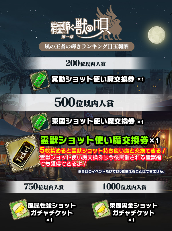 | 3000位 入賞 | スコアタオススメ使い魔交換券 スコアタオススメ使い魔交換券Ⅱ 東國・黒金・黄金ショット持ち使い魔がラインナップ | 各最大3枚 |