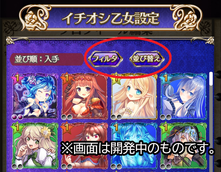プロフィール編集のイチオシ乙女設定画面にフィルタボタンと並び替えボタンが追加され、好きな乙女が選びやすくなりました。