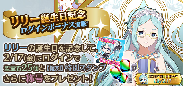 リリーの誕生日を記念して、誕生日当日にログインすると「聖霊石:25個」と、掲示板で使用できる【復刻】特別スタンプや、称号をプレゼント!!
