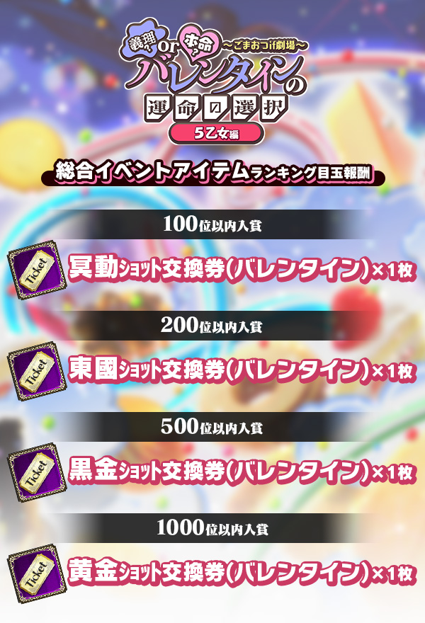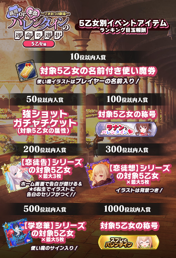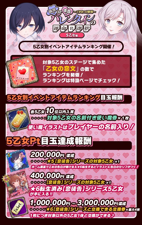 | 復刻バレンタイン5乙女交換券 過去のバレンタインテーマの5乙女と交換できる! | 最大18枚 | |