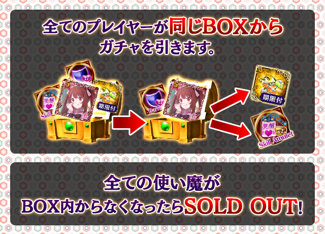 - 【BOX内すべての中身が0】もしくは【BOX内の目玉使い魔の残数が0】になった場合、「SOLD OUT」となり、本シェアBOXガチャを引くことができなくなります。